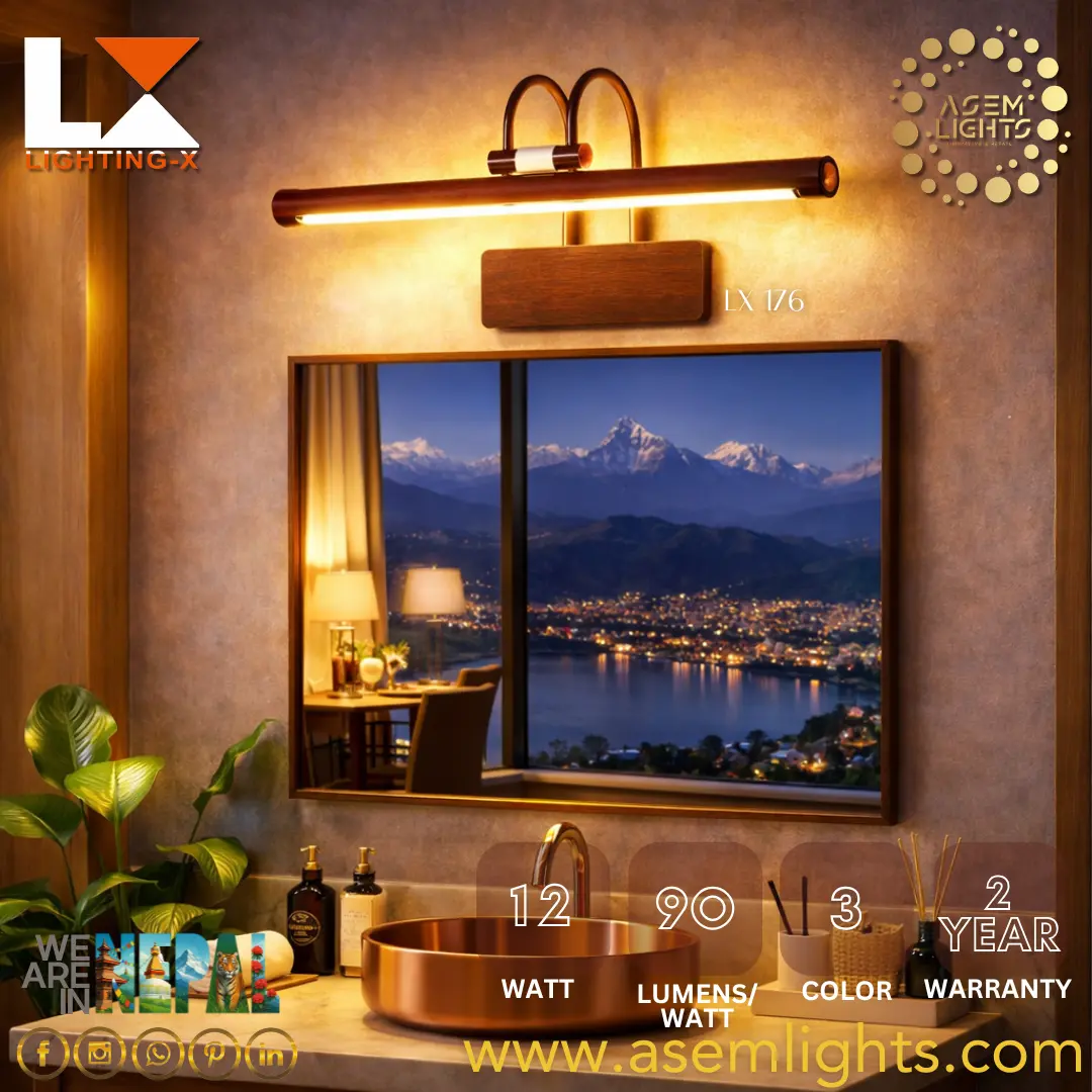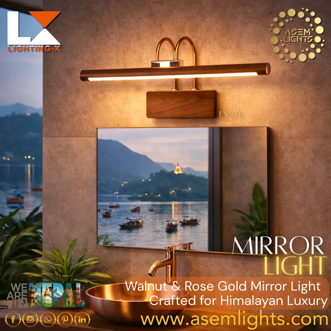Upgrade your space with our premium bathroom mirror light in Nepal, designed with an elegant walnut base and rose gold finish for a luxury look.